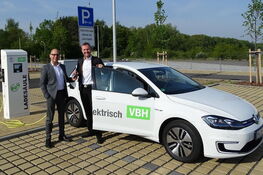 Wolf-Thomas Hendrich (l.), Geschäftsführer der Versorgungsbetriebe Hoyerswerda, übergibt Lohsas Bürgermeister (r.), Thomas Leberecht, den VW E-Golf der VBH. Die Möglichkeit der Nutzung der Lohsaer Ladesäule ist ideal, um das Auto für die Dienstfahrten vom Rathaus aus zu starten. (Foto: vbh)